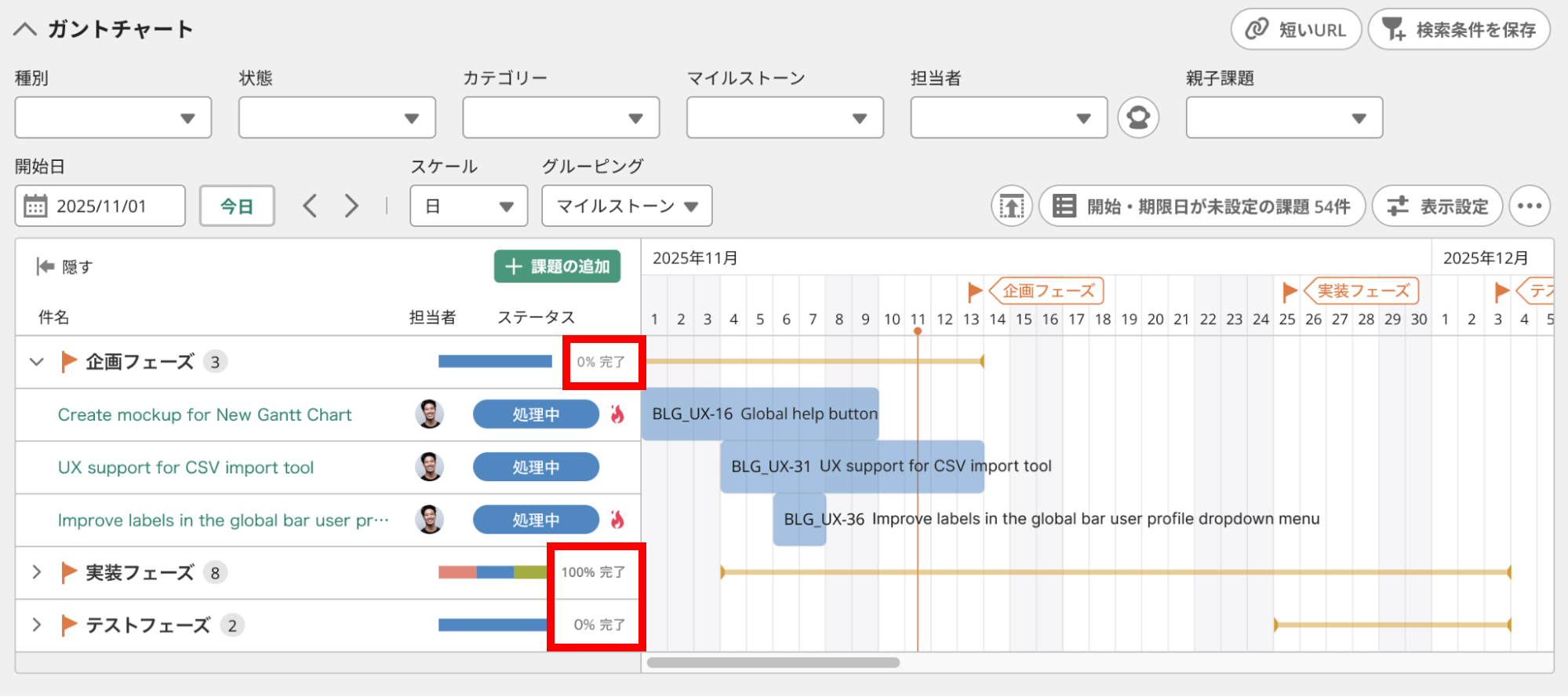 この変更により、グルーピングされた項目の行に、課題の完了率が表示されるようになります。