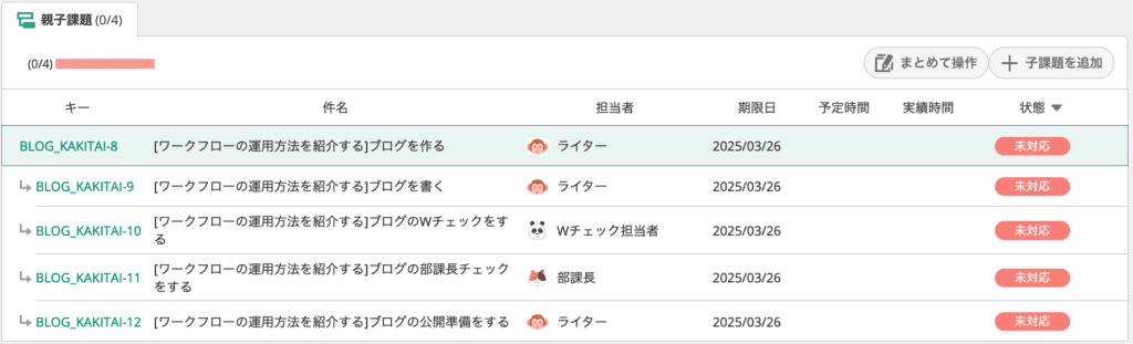 | 親子課題 | 依存関係にあるタスクを親子課題としてまとめて管理できる。 |