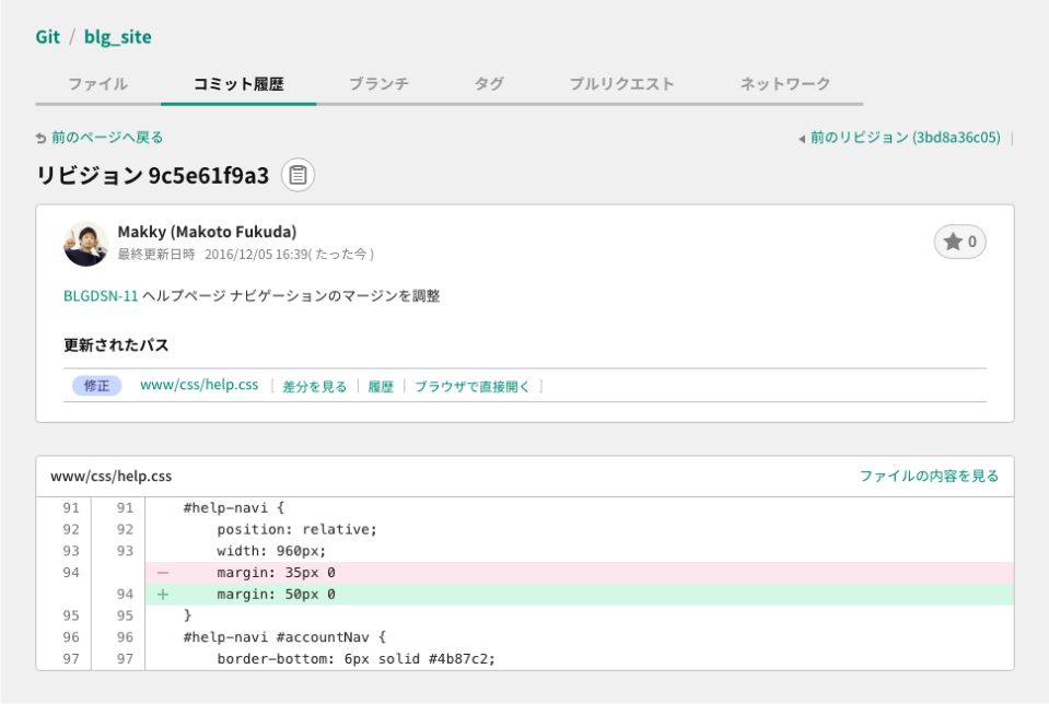 リビジョンの日時・更新者・コミットメッセージを閲覧できます。 このリビジョンで更新されたパスの一覧やファイルの差分もこの画面で確認することが可能です。 ユーザガイド Git